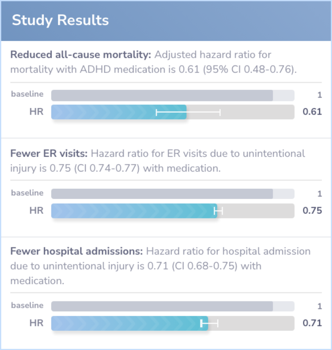 These findings suggest that ADHD medications, especially stimulants, align with current evidence by effectively reducing related risks but must be balanced against potential side effects as mentioned in the evidence for ADHD treatments.