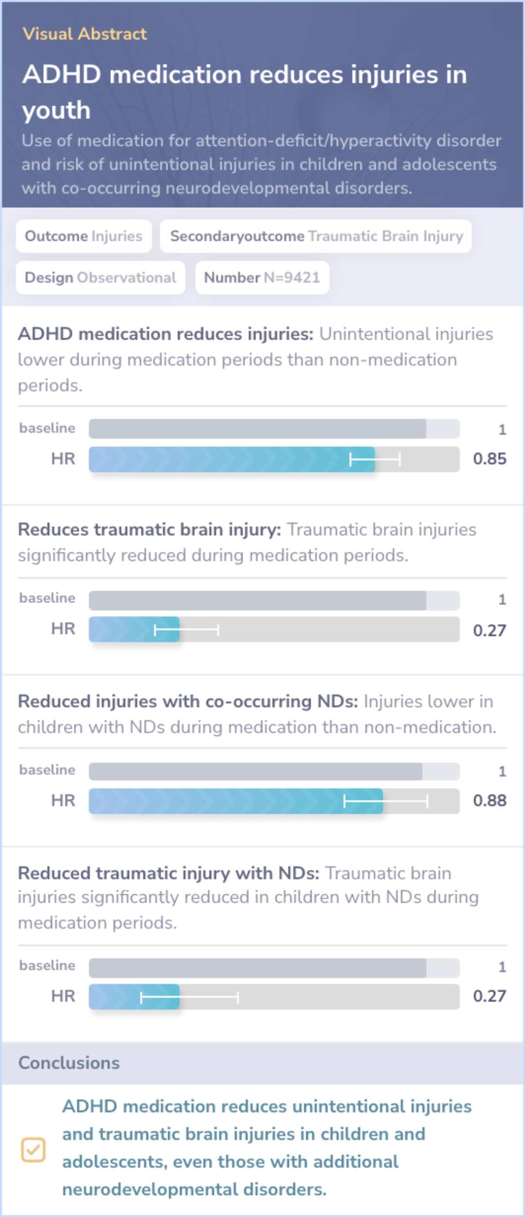 Core Insight:Both studies observe that ADHD medication is linked to reduced injury risks in youths, with added understanding of effects on those with co-occurring neurodevelopmental disorders.