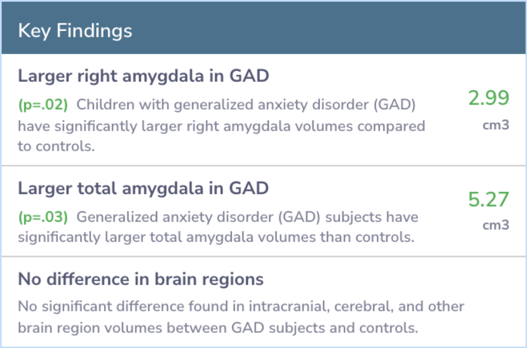 "Children and adolescents with GAD were found to have significantly larger right and total amygdala volumes than matched control subjects."