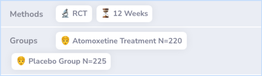 The study involved young adults aged 18-30 who were randomly assigned to receive either atomoxetine (220 participants) or a placebo (225 participants) over a 12-week period. To measure changes in ADHD symptoms, they used a tool called the Conners' Adult ADHD Rating Scale. Researchers also tracked quality of life, overall severity, and improvements as perceived by both doctors and patients.