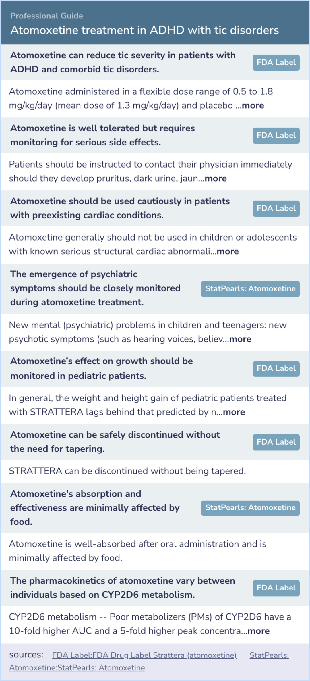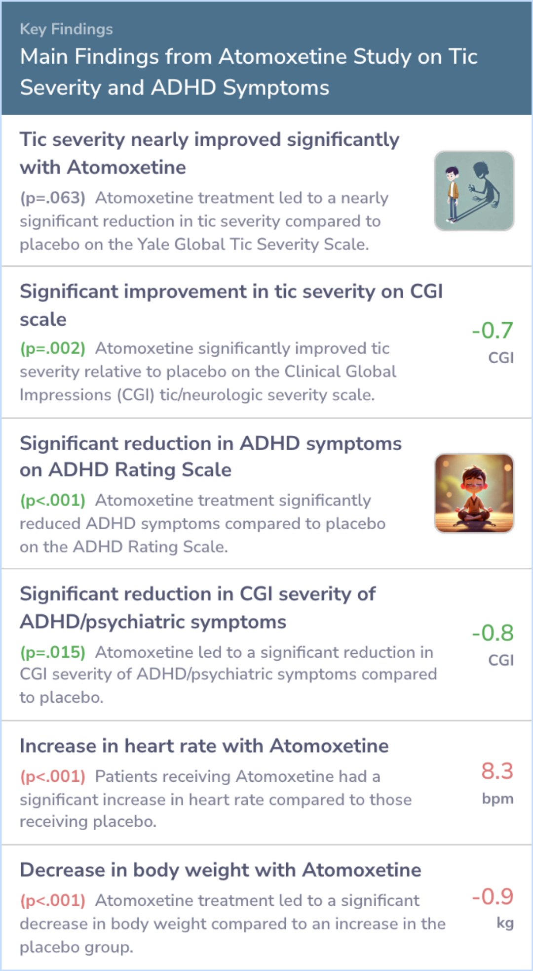 The findings align with the current understanding of atomoxetine's efficacy and safety in treating ADHD with comorbid tic disorders. Atomoxetine showed potential in reducing tic severity without significant adverse effects, which is reflected in the clinical guidelines provided.