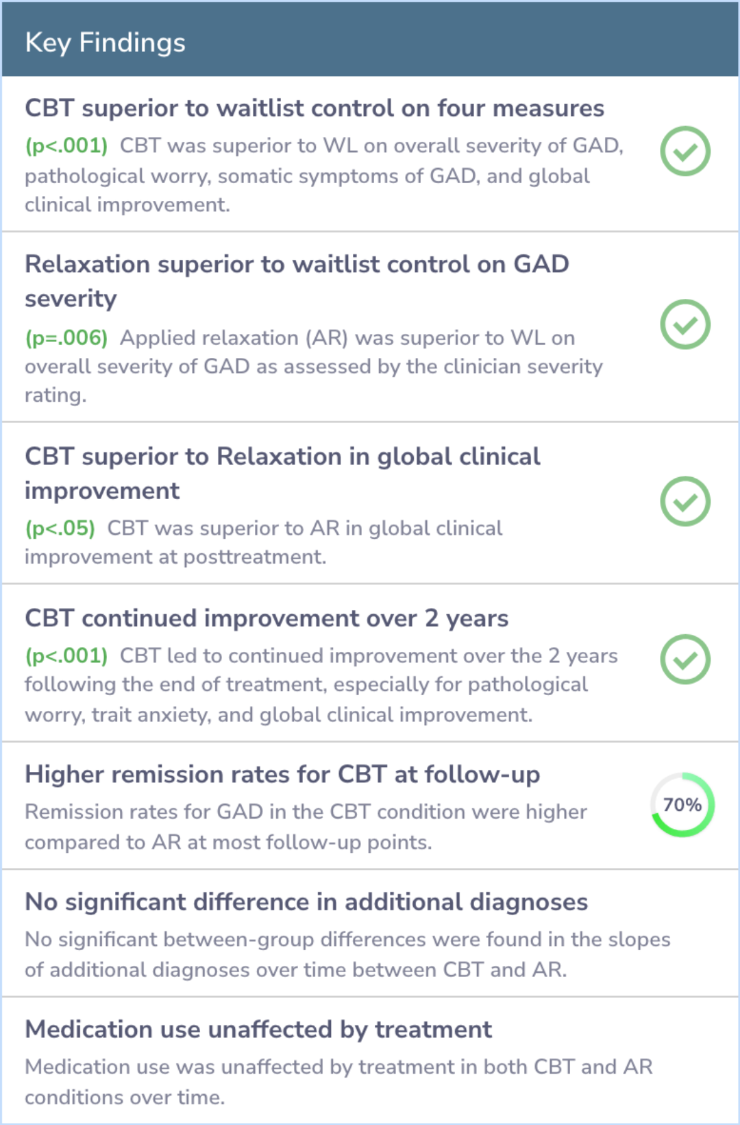 These findings align with current guidelines that suggest CBT is a highly effective treatment for generalized anxiety disorder.