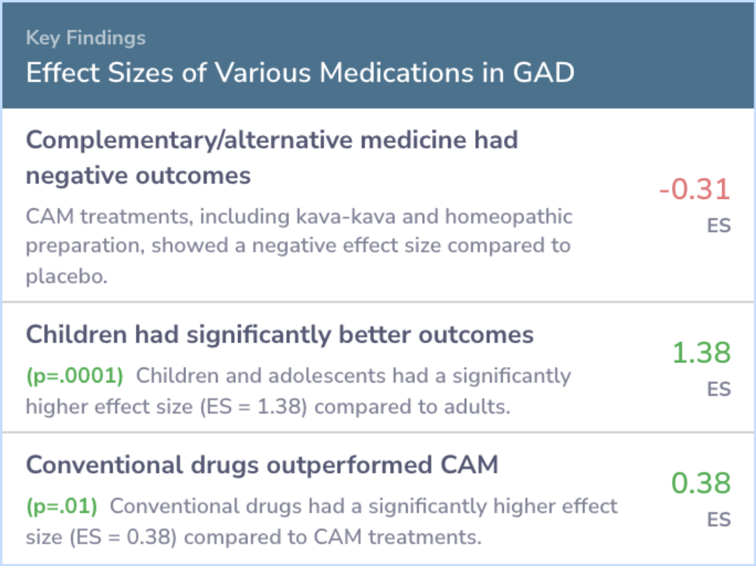 "CAM therapy had a negative mean ES compared with placebo. In other words, patients experiencing GAD taking a sugar pill did better than patients treated with kava-kava or homeopathy."