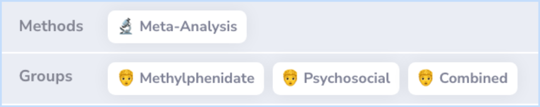 Both methylphenidate and psychosocial treatments reduce ADHD symptoms, but psychosocial treatments are less effective than the other two. Adding psychosocial treatment to methylphenidate doesnβt provide extra benefits for ADHD and teacher-rated oppositional defiant disorder (ODD) symptoms. However, for social behavior and parent-rated ODD, all treatments were equally effective. None of the treatments significantly improved academic performance.