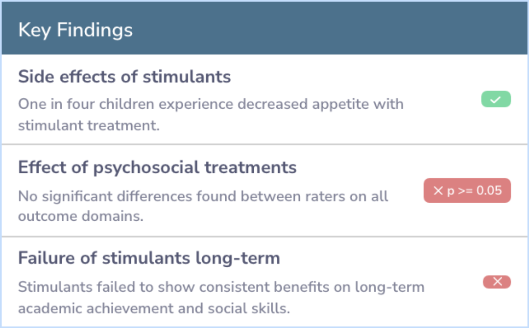 ADHD outcomes showed large mean weighted effect-sizes for both methylphenidate and combined treatments, psychosocial treatments had a moderate mean weighted effect-size; a similar pattern emerged for oppositional and conducted behavior symptoms. Soci...more