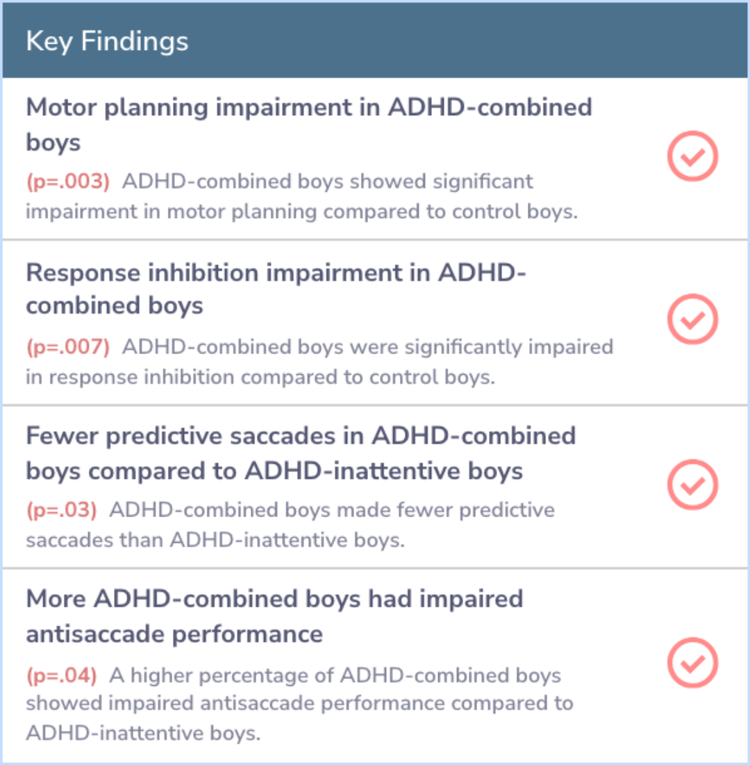 This study explored neurological differences between two ADHD subtypesβCombined (ADHD-C) and Inattentive (ADHD-I)βand their impact on executive functions like motor planning. Using oculomotor tasks, researchers aimed to determine if these subtypes represent distinct disorders or variations of the same condition.The findings highlight the unique challenges each subtype faces, suggesting ADHD-C involves greater motor control deficits, leading to more tailored treatment approaches.