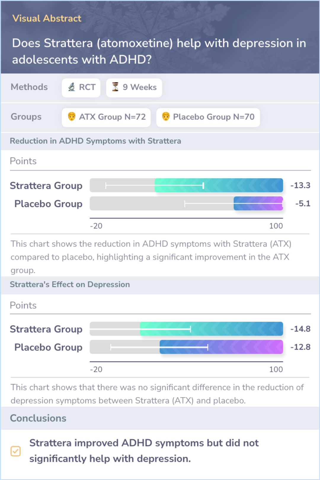 This study examined the effects of Strattera (atomoxetine) in adolescents with both ADHD and major depressive disorder (MDD). While Strattera significantly improved ADHD symptoms compared to placebo, it did not show a significant difference in improving depressive symptoms. Both groups had similar rates of treatment-emergent mania, and no suicidal ideation or behavior was reported.