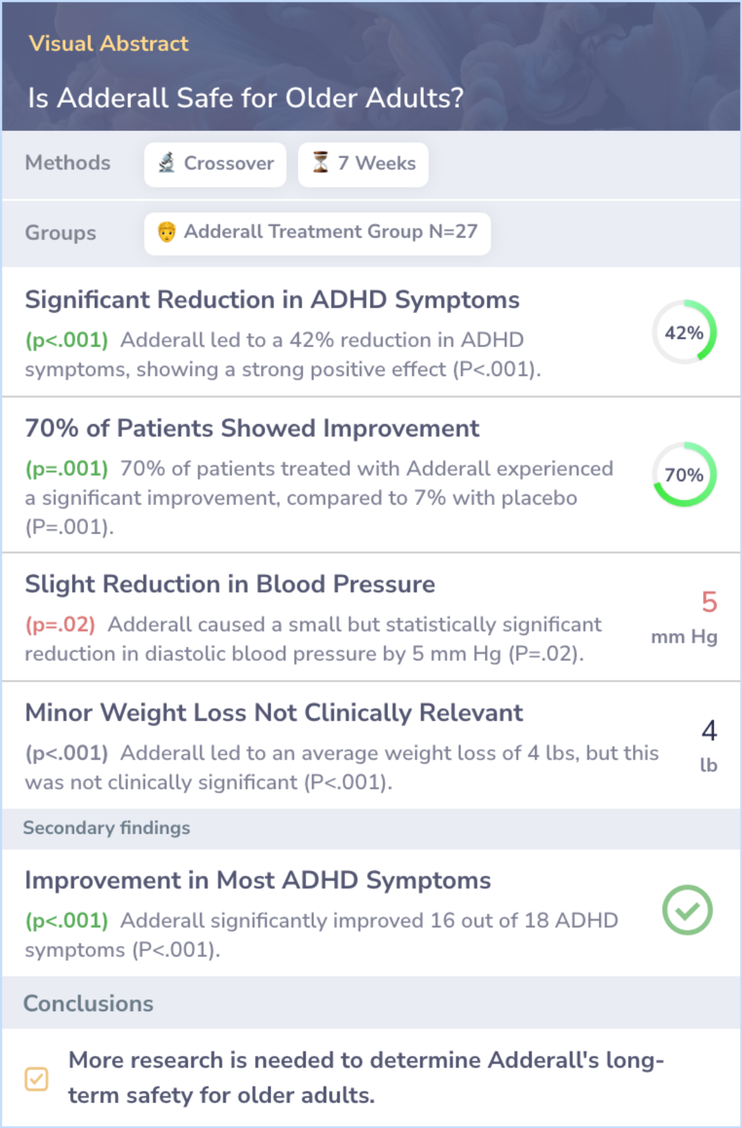 A short-term study showed Adderall helps reduce ADHD symptoms in adults, but long-term safety, especially for older adults, is not clear.
