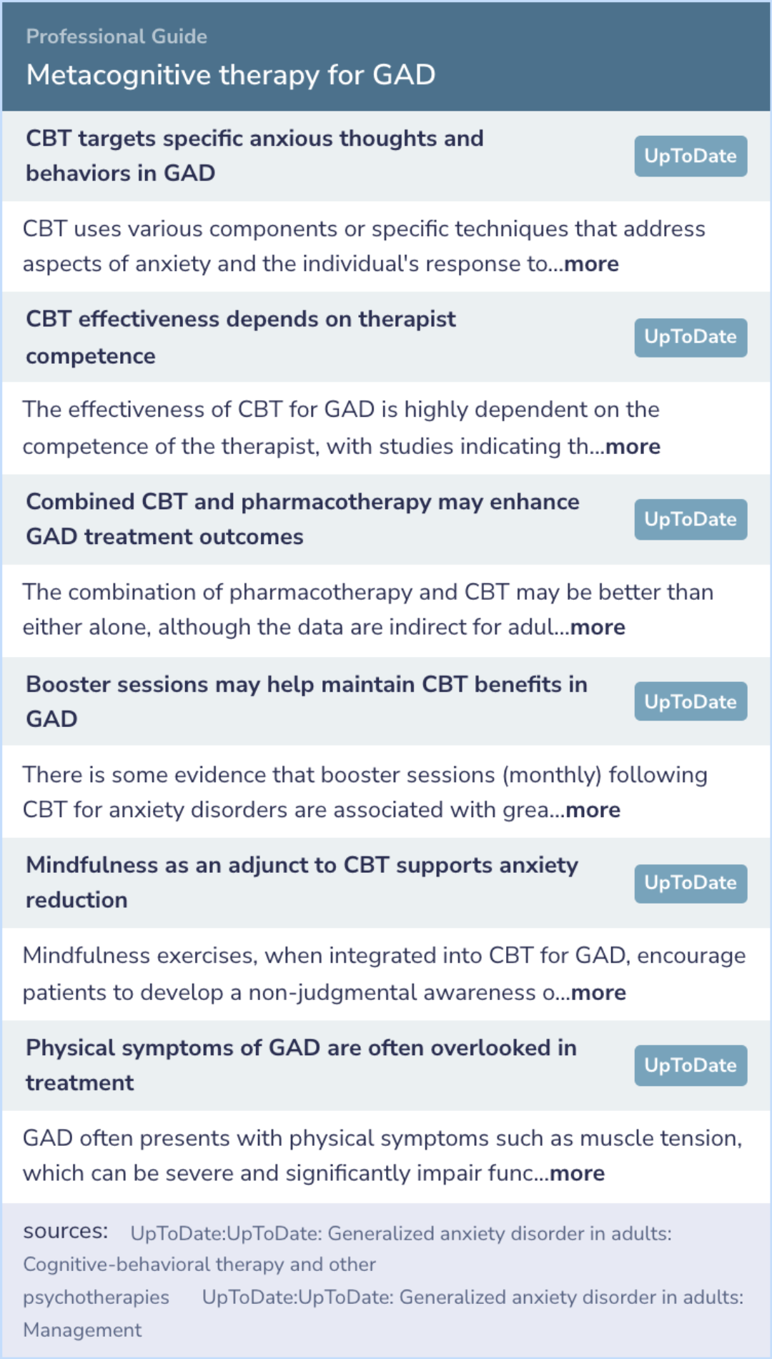 In line with the promising results of the metacognitive model for GAD, CBT proves effective when it targets specific anxious thoughts and behaviors through structured techniques.