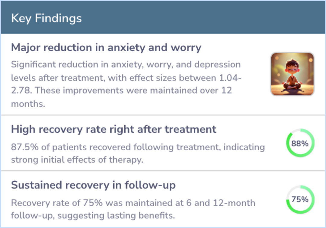 Patients experienced significant improvements in worry, anxiety, and depression with lasting changes at 6 and 12 months after treatment.