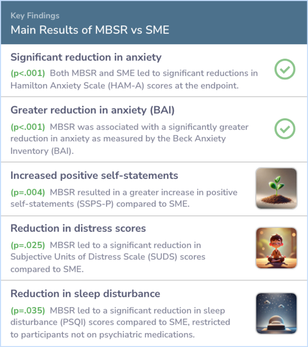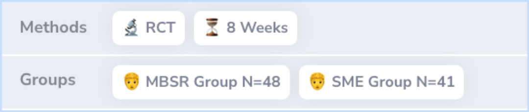 Moreover, the MBSR group showed better results in stress and anxiety measures during a lab stress challenge and increased positive self-statements. This suggests MBSR had more notable benefits compared to the SME group.