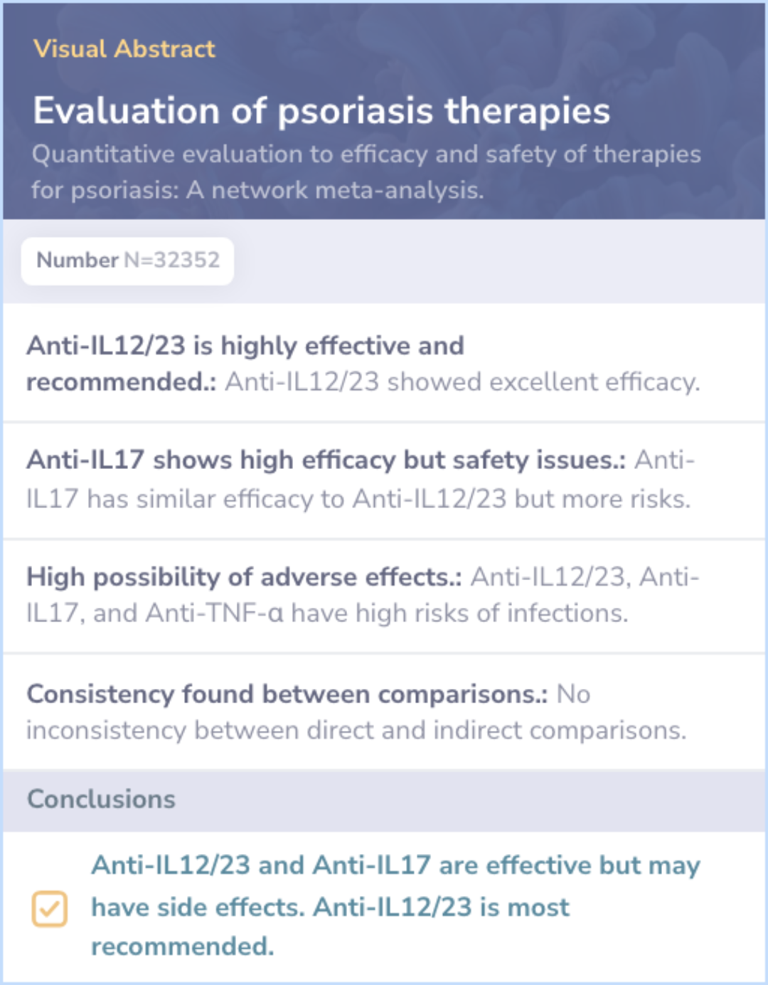 Adverse effects of therapies:Anti-IL12/23, Anti-IL17, and Anti-TNF-α have a high chance of causing infections.