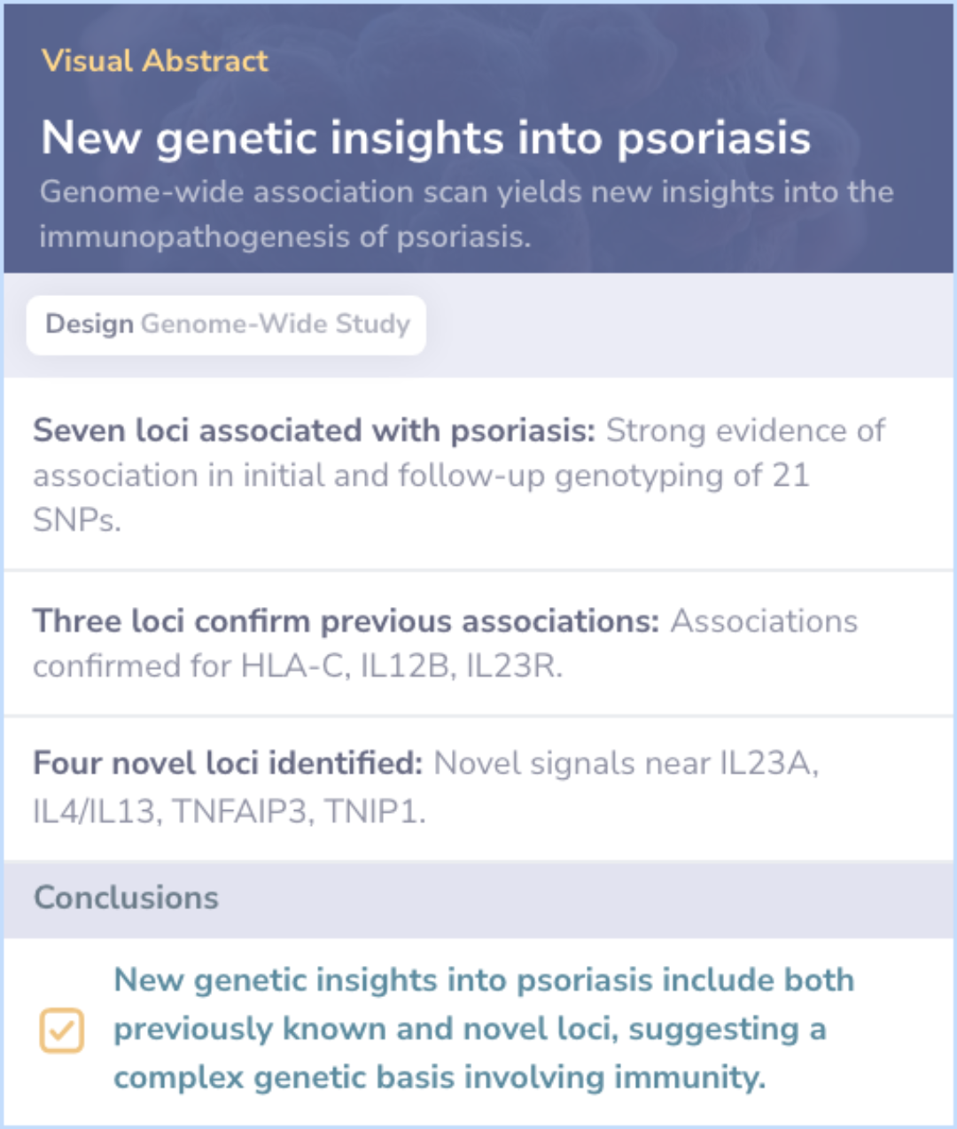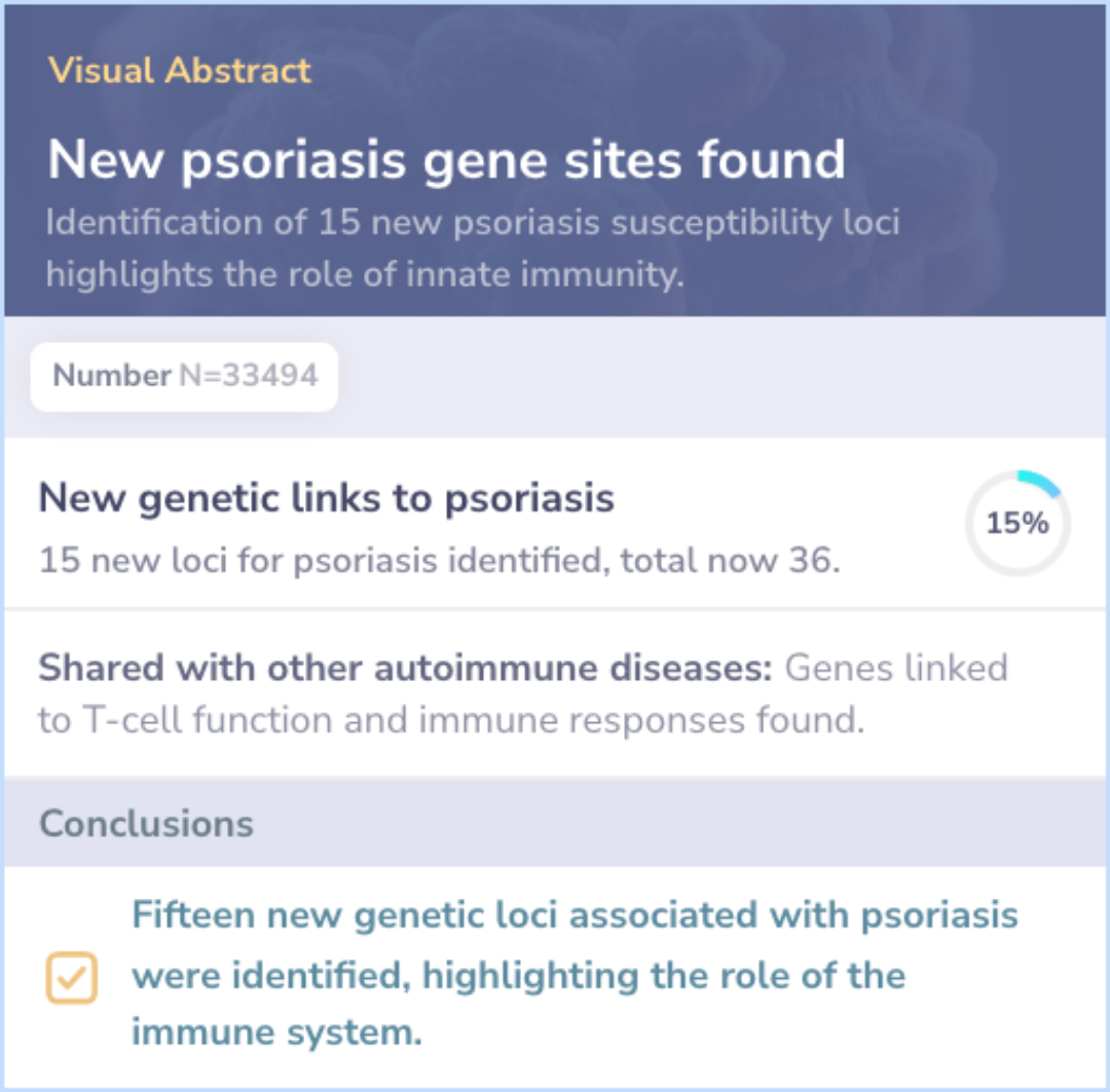 New genetic signals identified:Novel associations found near IL23A, IL4/IL13, TNFAIP3, and TNIP1.