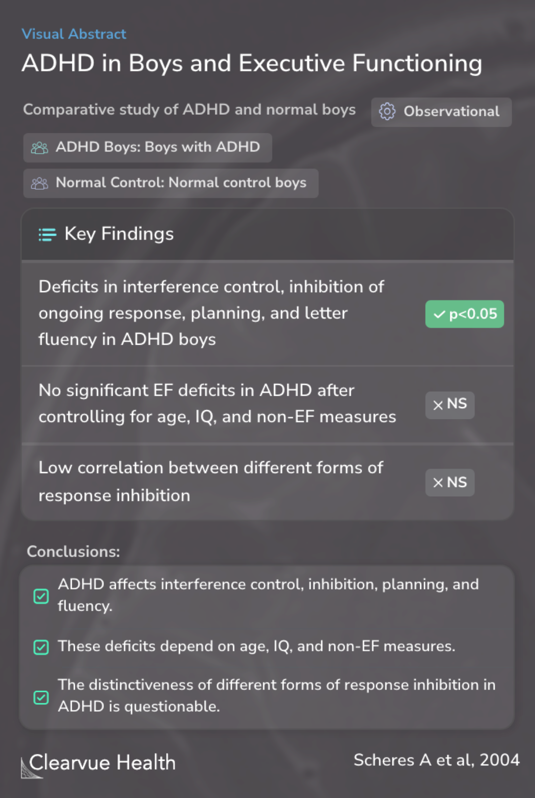 The conclusions drawn from this study are insightful. They suggest that while boys with ADHD may exhibit deficits in inhibition, these are not solely due to ADHD itself but are influenced by other factors such as age and IQ. The findings also raise questions about whether the different forms of inhibition deficits observed in ADHD are indeed distinct or part of a broader pattern of executive dysfunction. These insights add valuable context to the ongoing discussion about ADHD and its impact on executive functions.